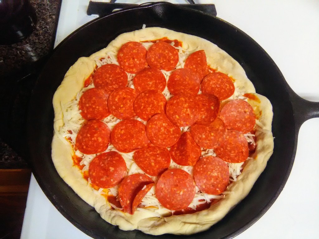 I did more of a deep dish tonight, but you can do whatever your family likes. Because of limited kitchen space, I don’t own a pizza stone, but the cast iron skillet worked like a dream.