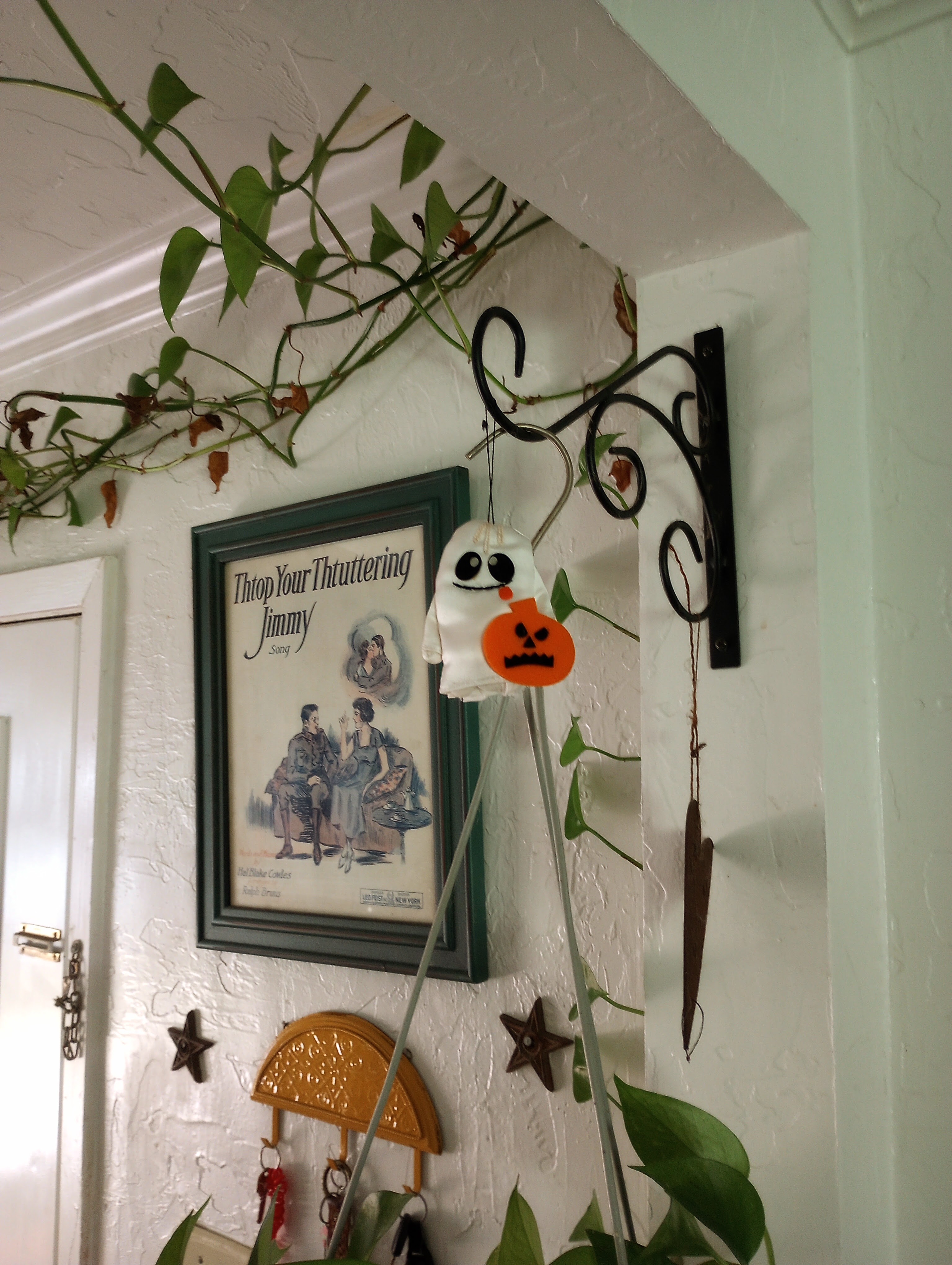 I’ve noticed people have started putting out Halloween decorations. Ours are kept in the shed in the backyard. Because of our homicidal rooster, that sent me to the ER a few months ago, I’m going to have to wait until Donny’s next day off. Jackson and I did find this cute little guy at an estate sale. He was 10 cents so we couldn’t pass him up.