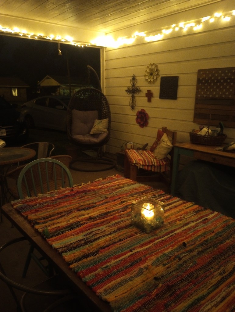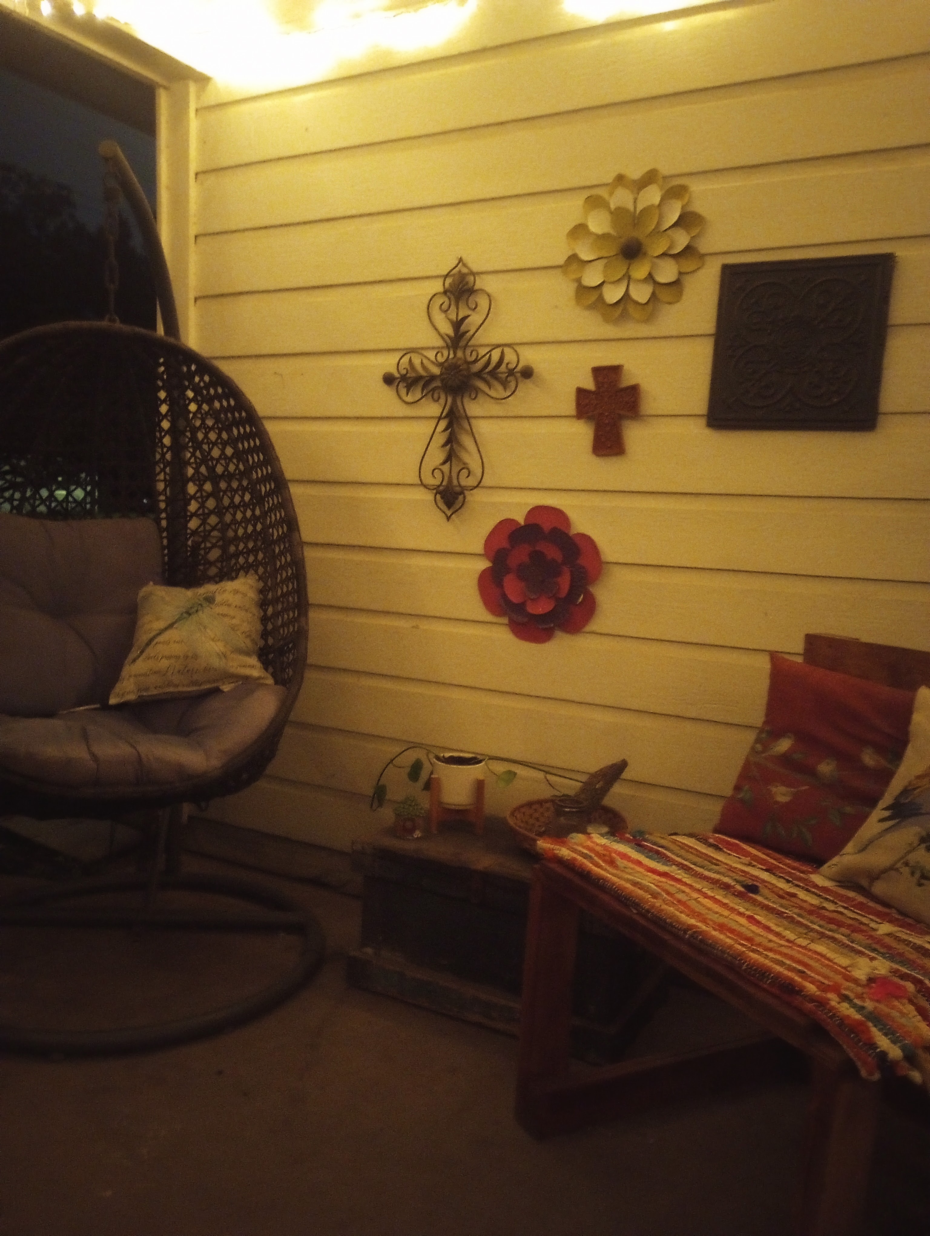 I brought it home and spray painted it. I didn’t know where to hang it, but then I realized it would look good against our turquoise door. So that’s where it ended up. For $3.00, I think it looks pretty good.