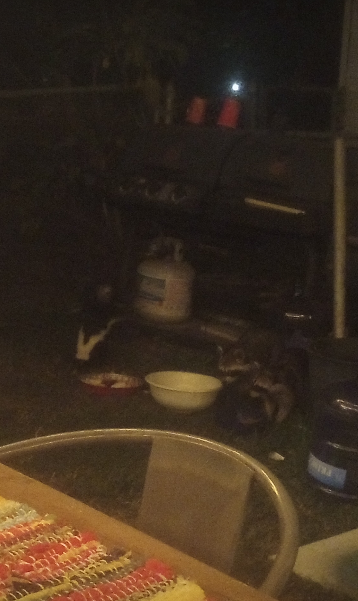 Tonight’s menu was ham, mashed potatoes, peanut butter sandwich, peanut butter crackers, peanuts, grapes, frosted mini wheats and marshmallows. They also get a bowl of cat food. I was so happy when I saw the skunk and raccoons eating together. It hasn’t always been that was. I think that they have worked out their problems.