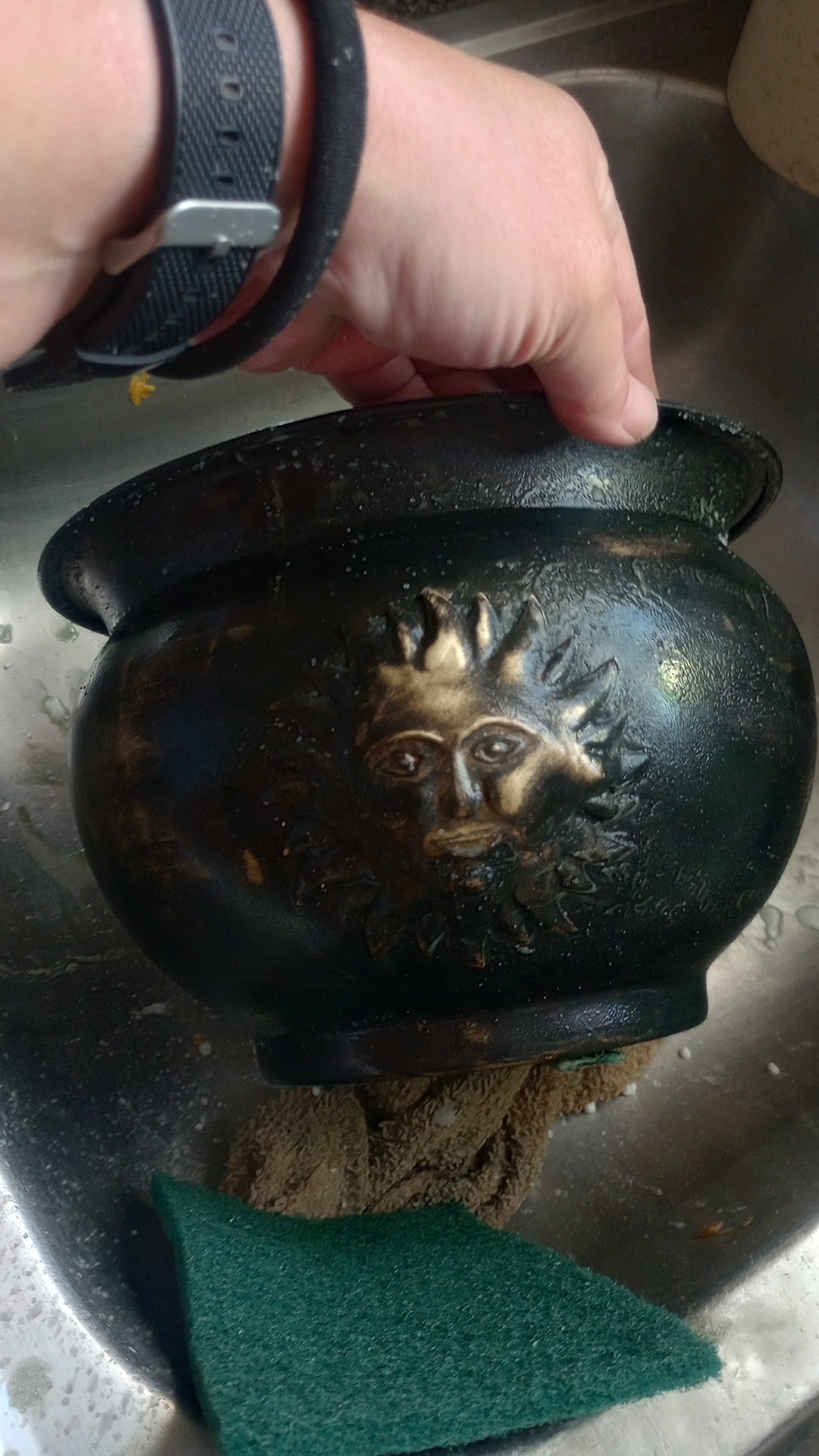 I finally got all of the donations bagged up. There were piles sitting in our living room for weeks. Jackson and I took them to the thrift store. We decided to go inside and see if we could find any treasures. I found this planter that still had the original makers sticker on it. Even though it was completely and horribly tarnished, it was marked solid brass so I picked it up.