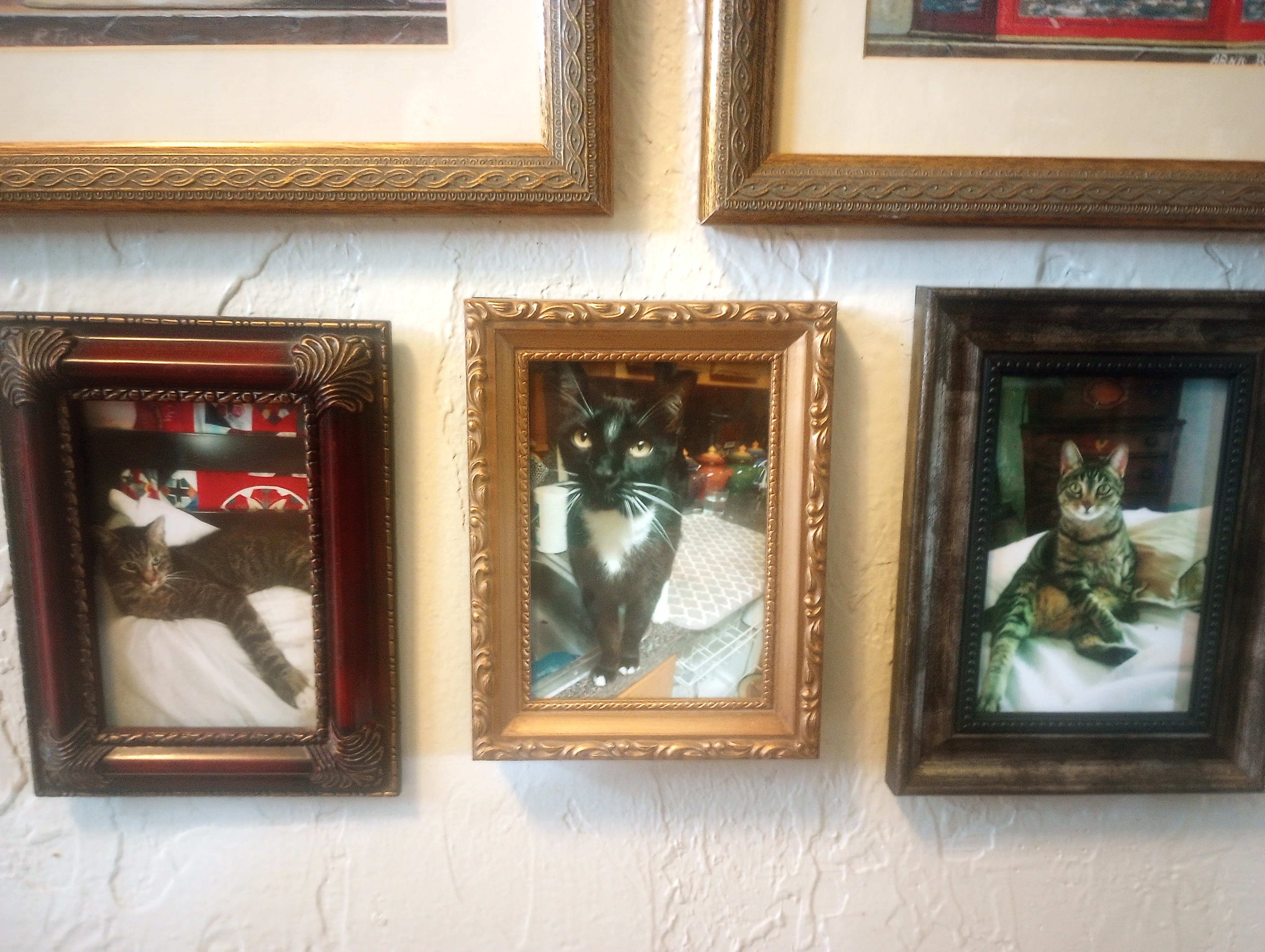 Just because we have 2 newer cats doesn’t mean that we will ever forget our sweet babies that have passed on. I didn’t want the other cats to forget them either so we did a homage to them. I put them above the cats food station and I have caught Milo looking at them.