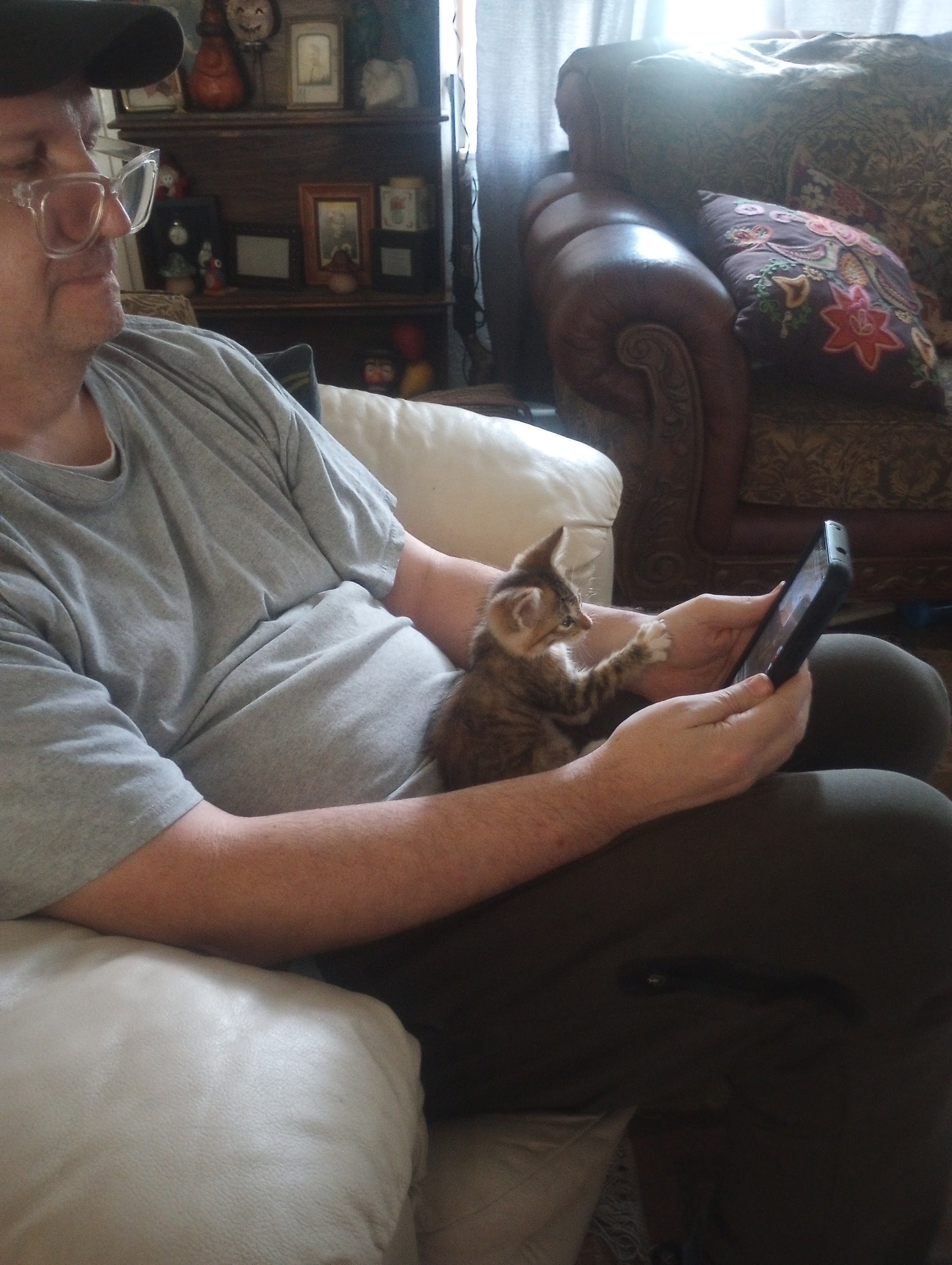 She slept curled up under Donny’s chin last night. The other cats are starting to warm up to her finally. She definitely brings happiness to our family.