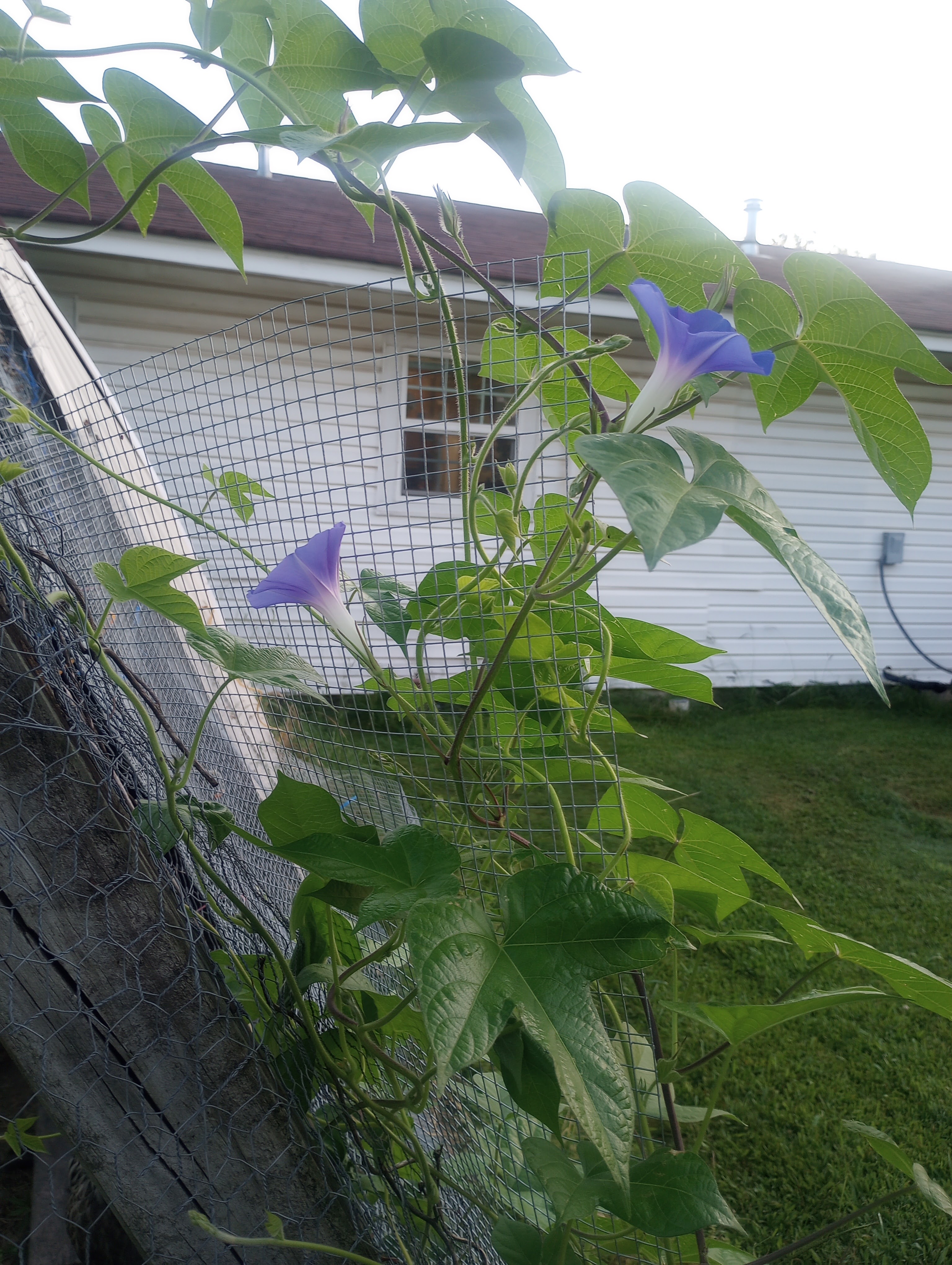 When I went to let the chickens out I noticed our Morning Glories are blooming.