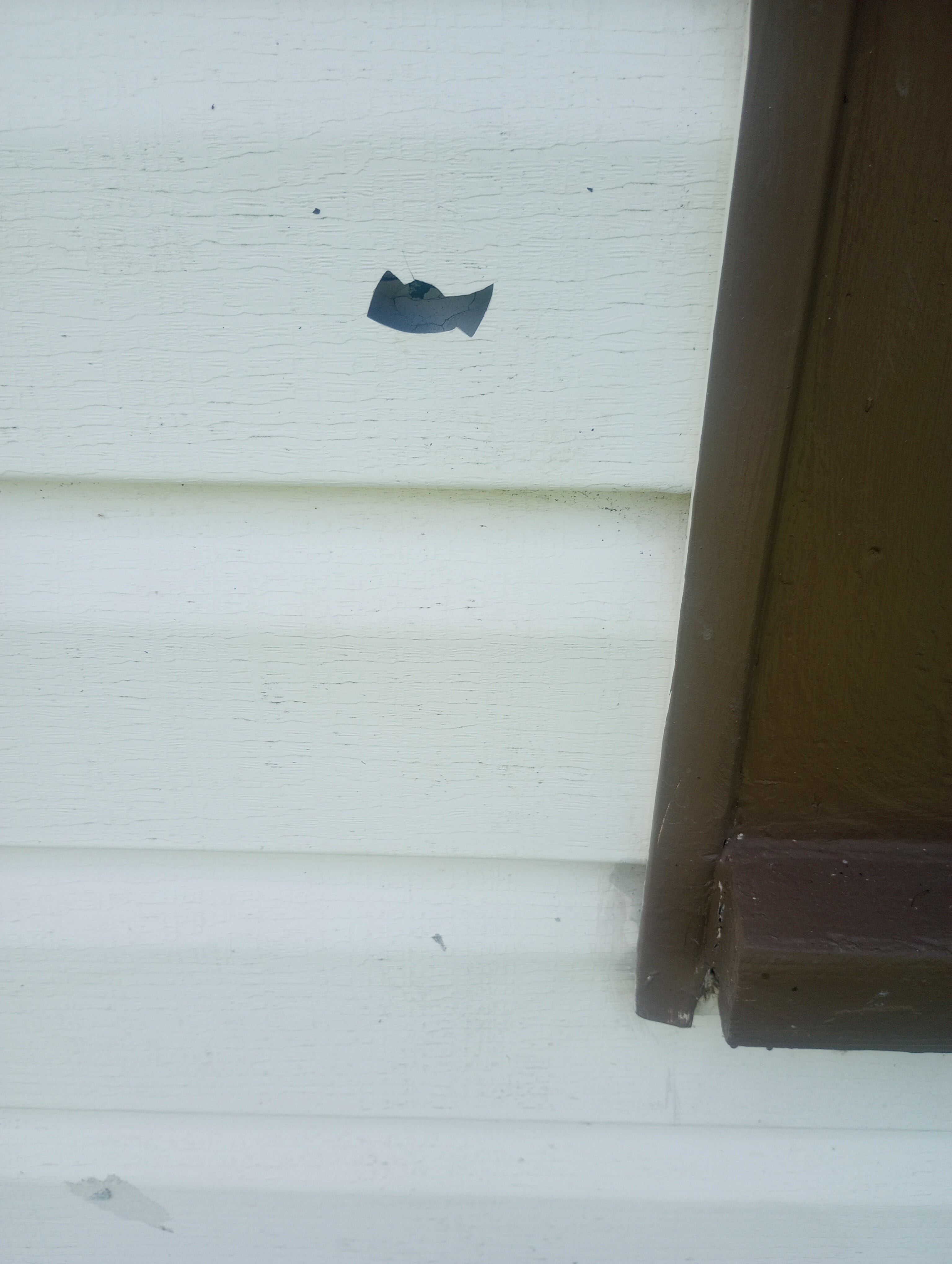 Because we live in an old house with old siding we sometimes get holes in the siding. Drives me crazy so I decided to try a cheap fix. Here’s one of the holes.