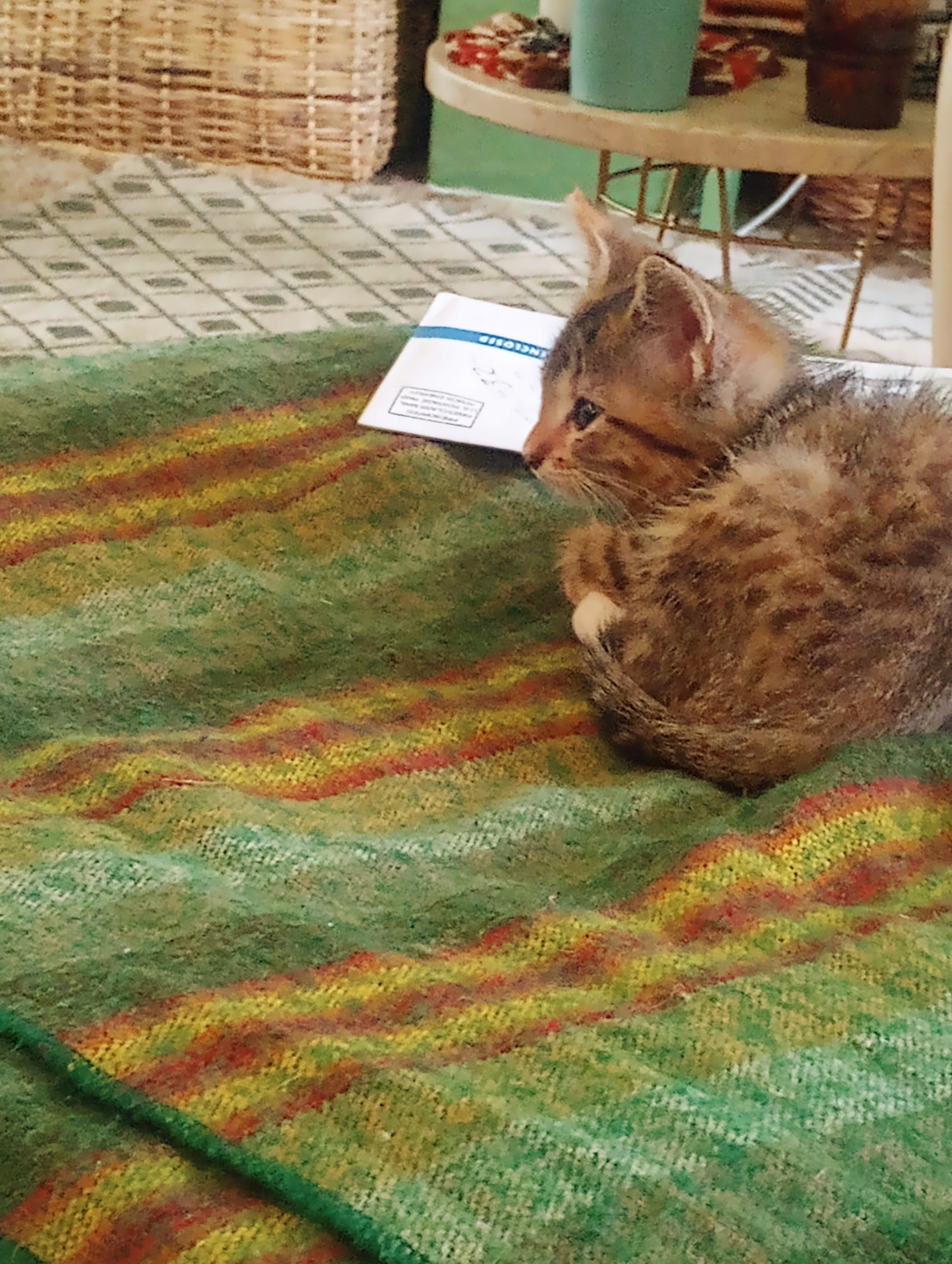 The kitten wanted to go outside because the other cats were out there. We can’t just let her out yet so I remembered we had this harness when we were taking care of the baby possum. She didn’t fight it too badly.