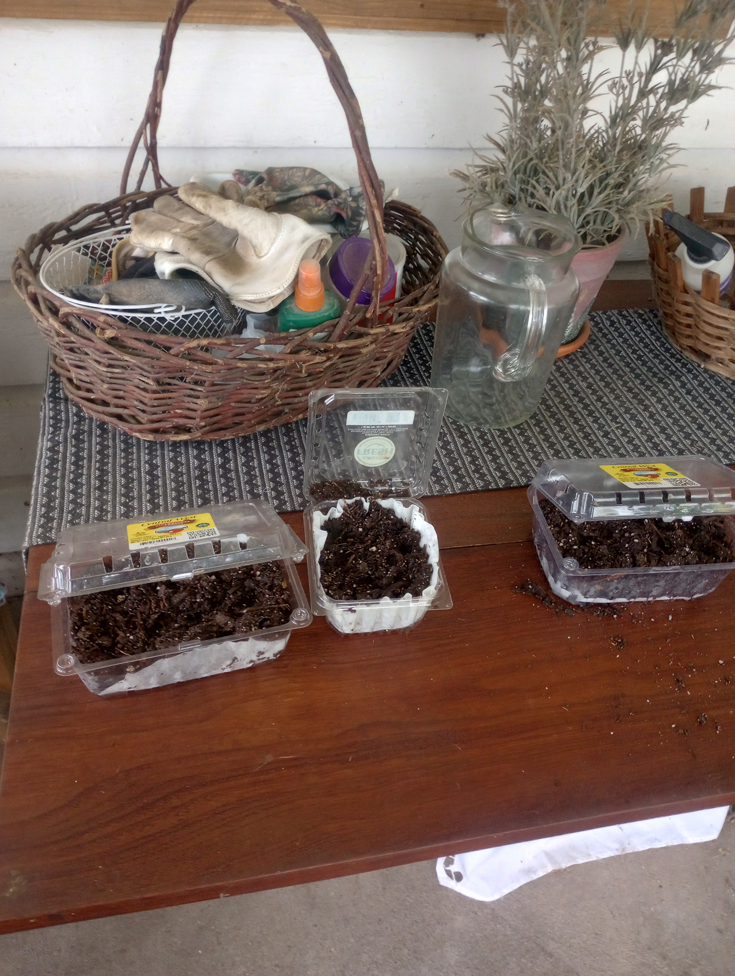 We didn’t really know where to plant them. We did pumpkins one year in the front and they took over the yard. I decided to go ahead and start some of them in empty strawberry and blueberry containers.