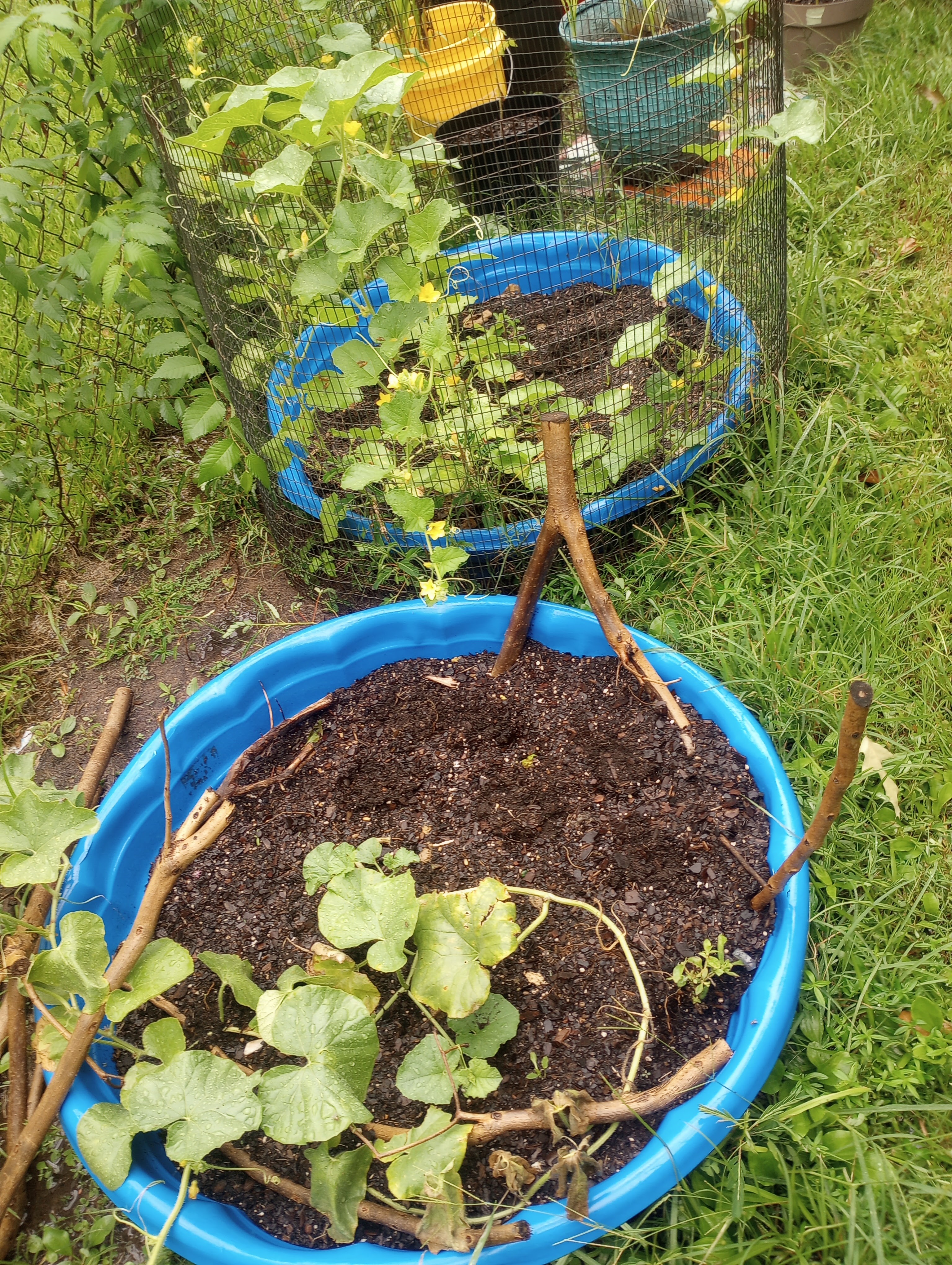 The seeds I had leftover went into the pools where the cantaloupe vines are. The unfilled seeds are in the protected pool. The filed ones leftover are in the unprotected one.