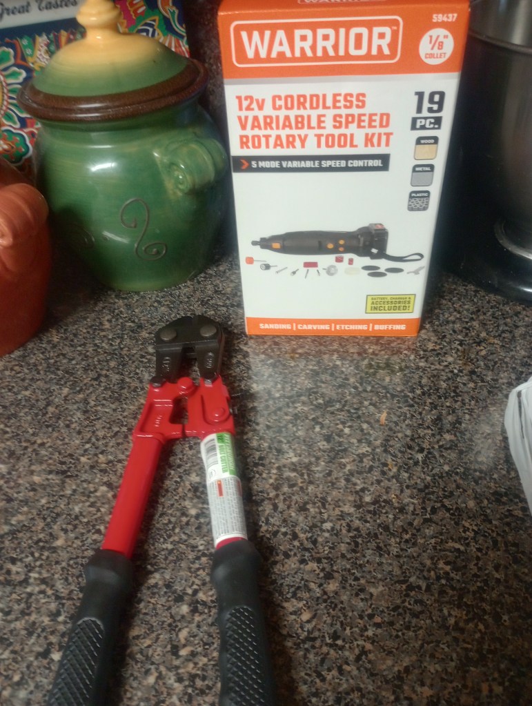 We went to Harbor Freight so that I could get my bolt cutters and sanding tool.
