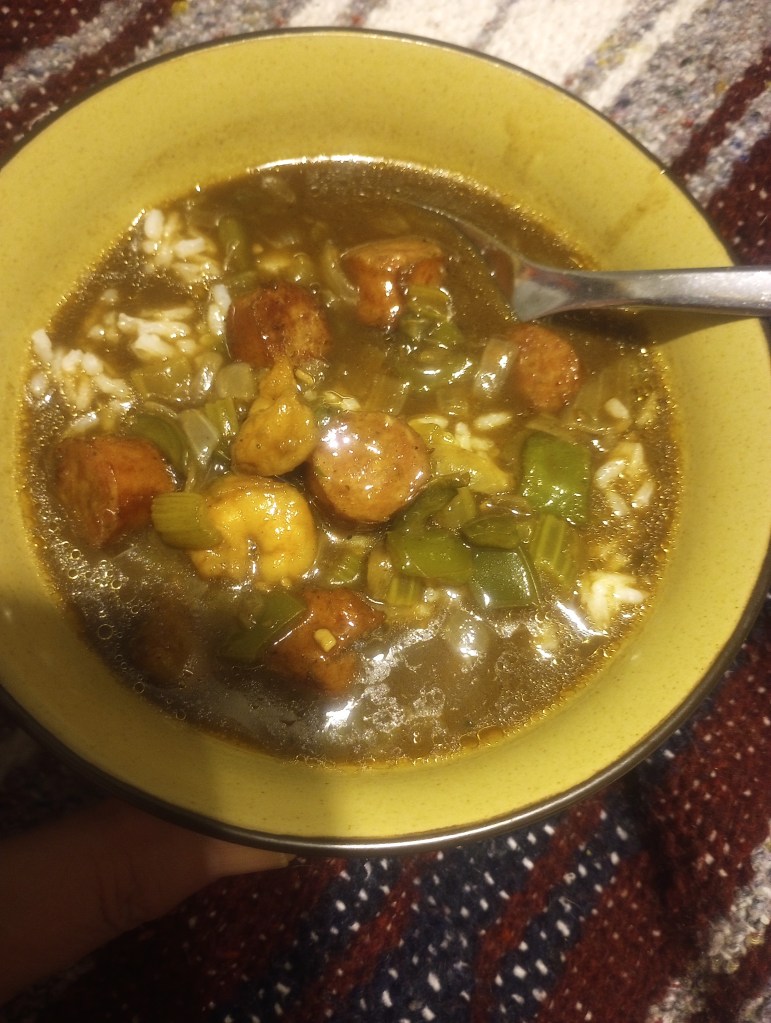 Tonight I made gumbo. I was very excited because I had found a gluten free all purpose flour. Reddit said that it can be used in a roux. If you have ever made a dark roux you know that it is a labor of love. It’s 40 minutes of stirring, stirring, stirring. Donny had to bring me a stool so I could see into the pot. (I used my big catering pot) I was skeptical because it wasn’t thickening like a normal roux. I finally got it to the chocolate brown color. Y’all, it turned out so good. I did end up adding two cornstarch slurries just so I had the thickness I prefer.