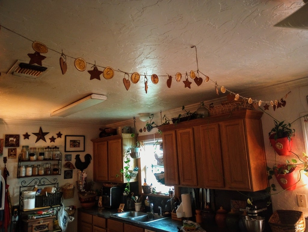 On another note, I finally finished my orange garland. I decided to hang it in our dining nook.