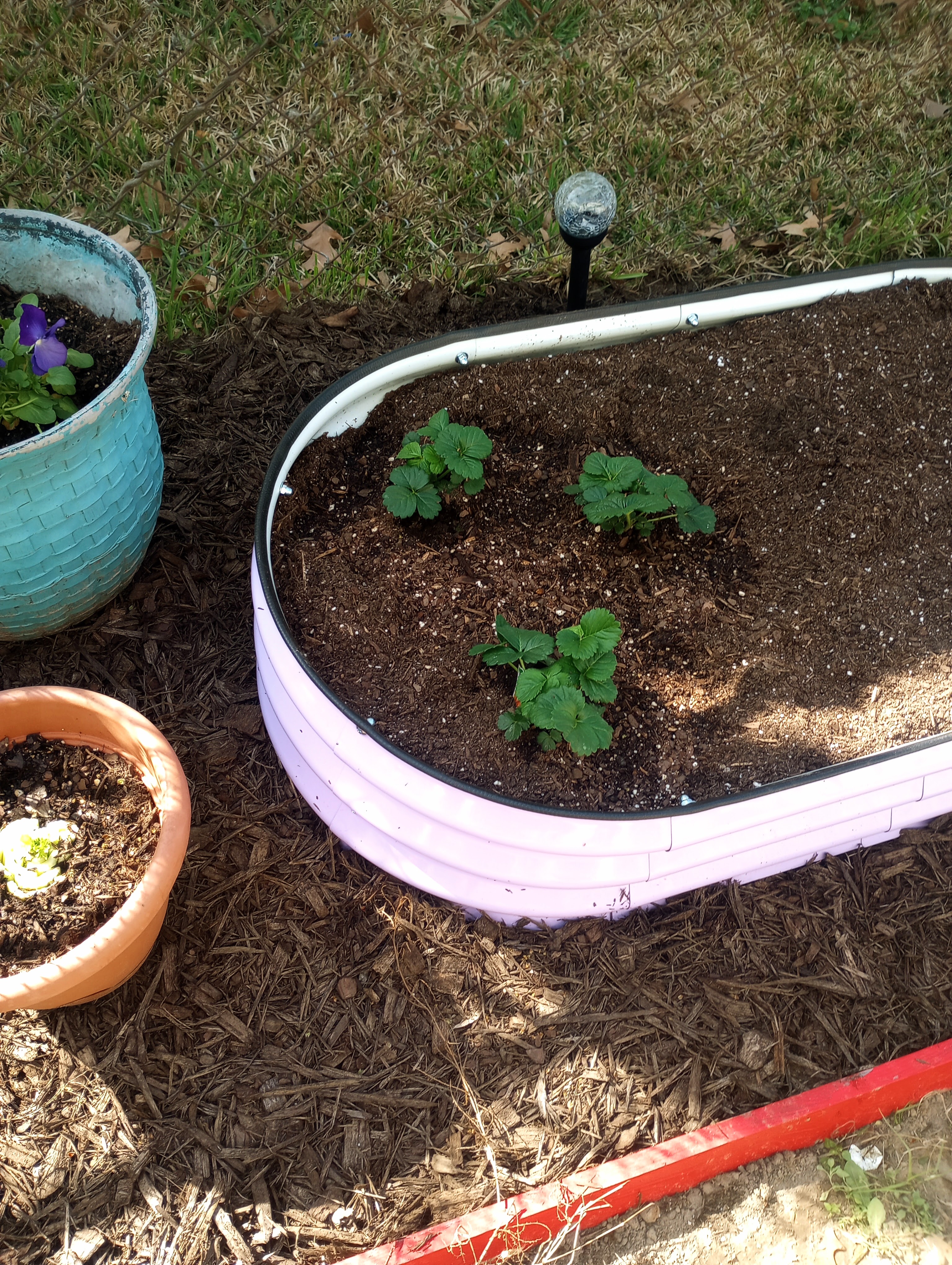 Yesterday I had to run to Home Depot to get the rest of the soil I needed to finish up filling the raised beds. The front garden is so shady that it takes forever for something to grow. I found out that Impatiens and Vincas do well in shade so I looked for some there. No luck so I headed to Walmart where, online, it said the flowers were available. I could not find any of those flowers inside or out. I did find some tomato plants. I do not like the beefsteak or any of the large variety tomatoes. I prefer Roma but the smaller tomatoes are so hard to find for some reason. I picked up the last two that they had. Even Home Depot only had the large variety. While I was there I also picked up some strawberry plants.