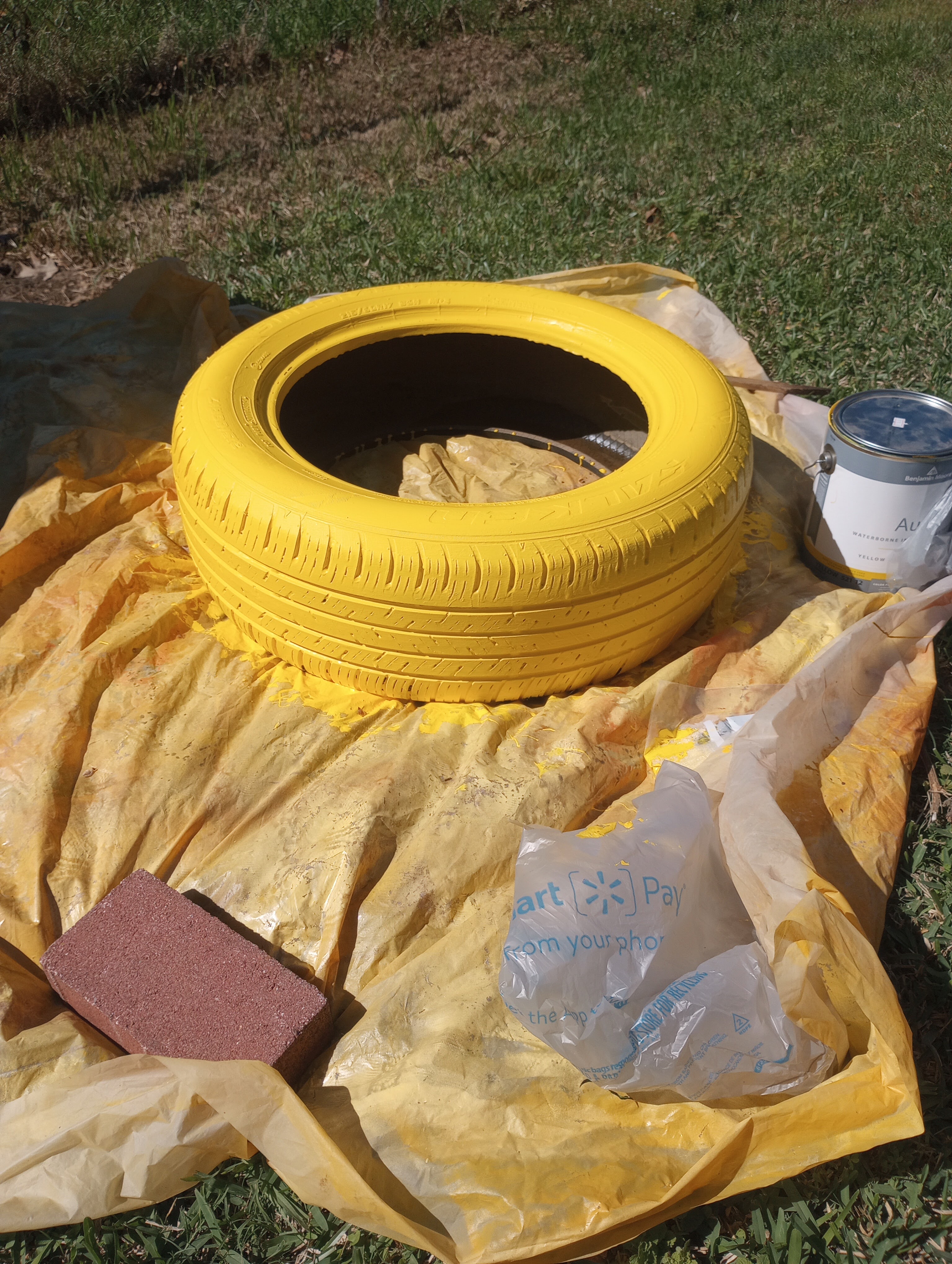Fridays are like every normal person’s Sunday for us. It’s like the end of the weekend because Donny has Thursdays and Fridays off. Since we did all of our running around yesterday today was home day. While he was cleaning out and fortifying the chicken coop (we had a possum sneak in the other night in the wee hours) I was painting one of the old tires that we had in the backyard. Donny had used it for planning potatoes a few seasons ago and I wanted to spruce it up and use it for cucumbers.