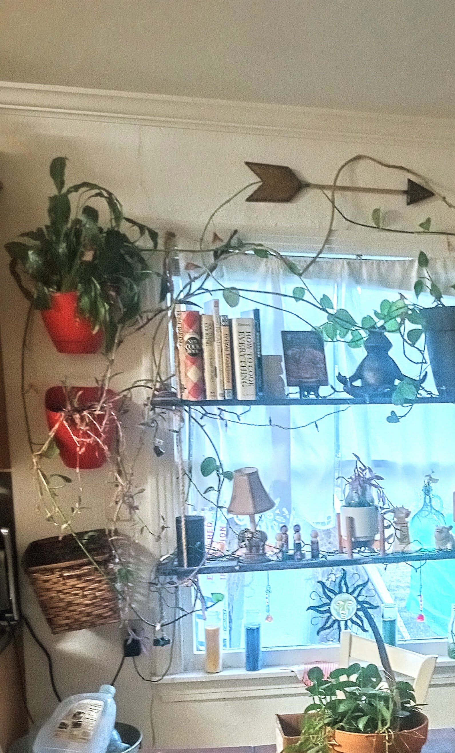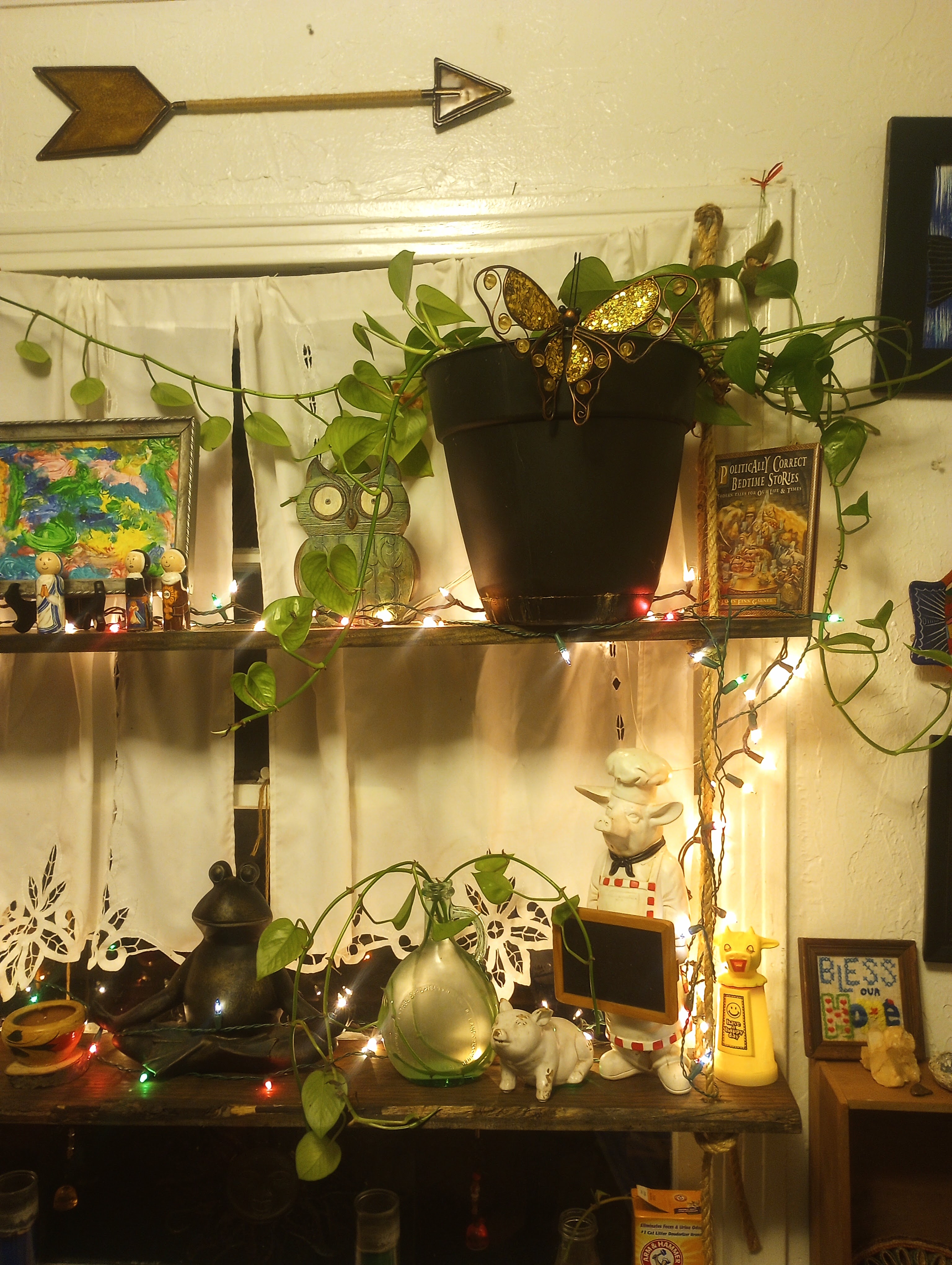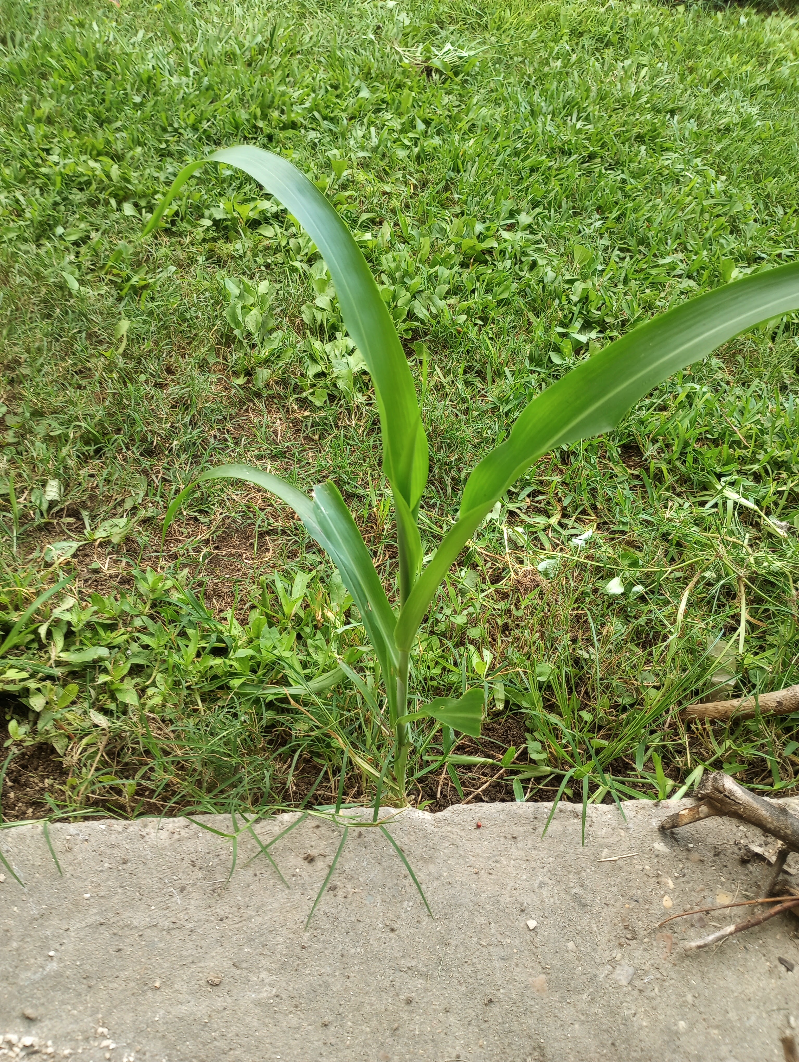 We even have a corn stalk. A piece of corn from the bird feeder must have fallen down and sprouted. I thought it was funny so I just left it to grow.