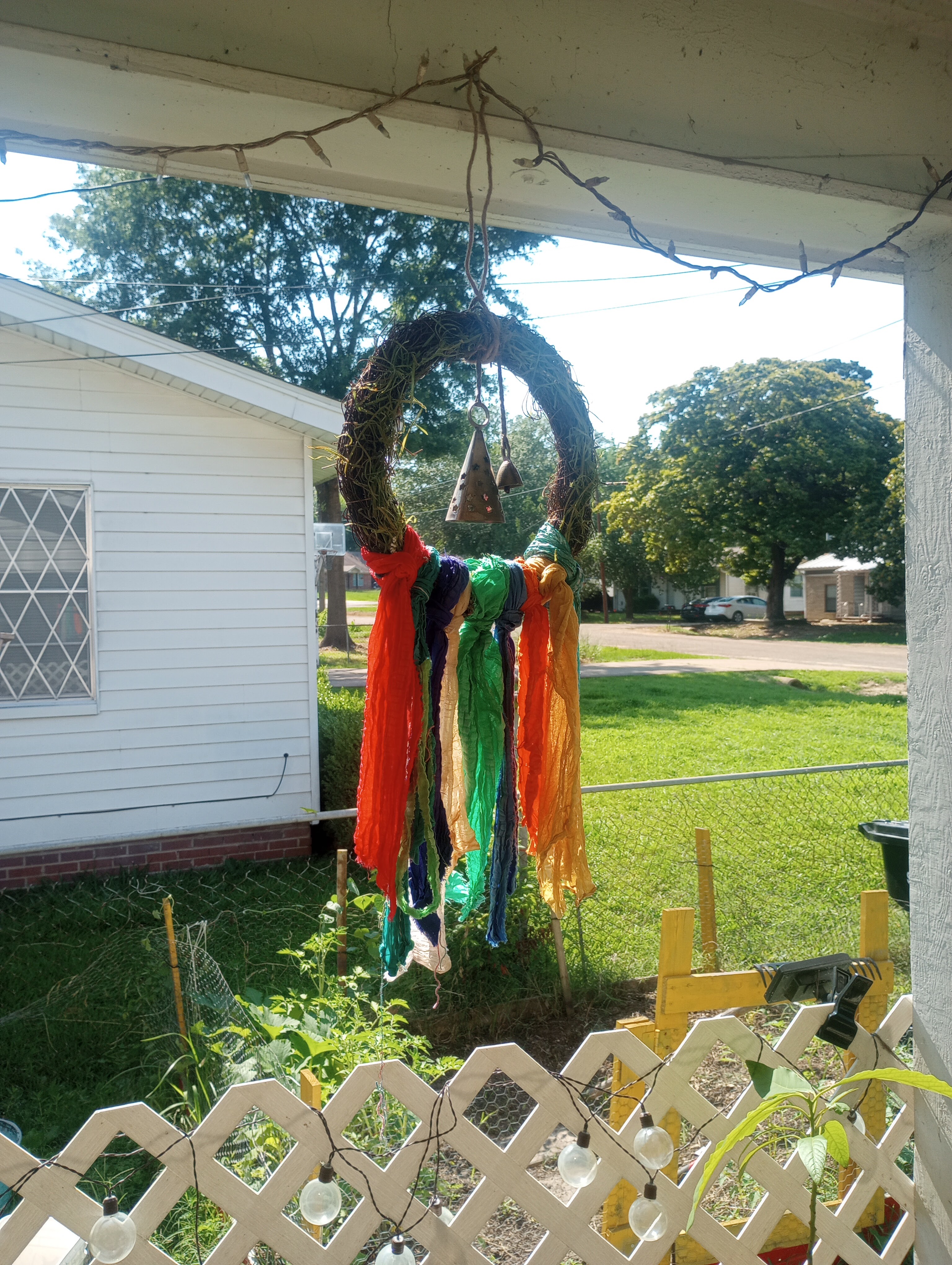 I’m still trying to work on the back corner, but we’ve just been getting so much rain lately, I haven’t had the chance. I did make a little bell wreath for the patio on one of those rainy days.