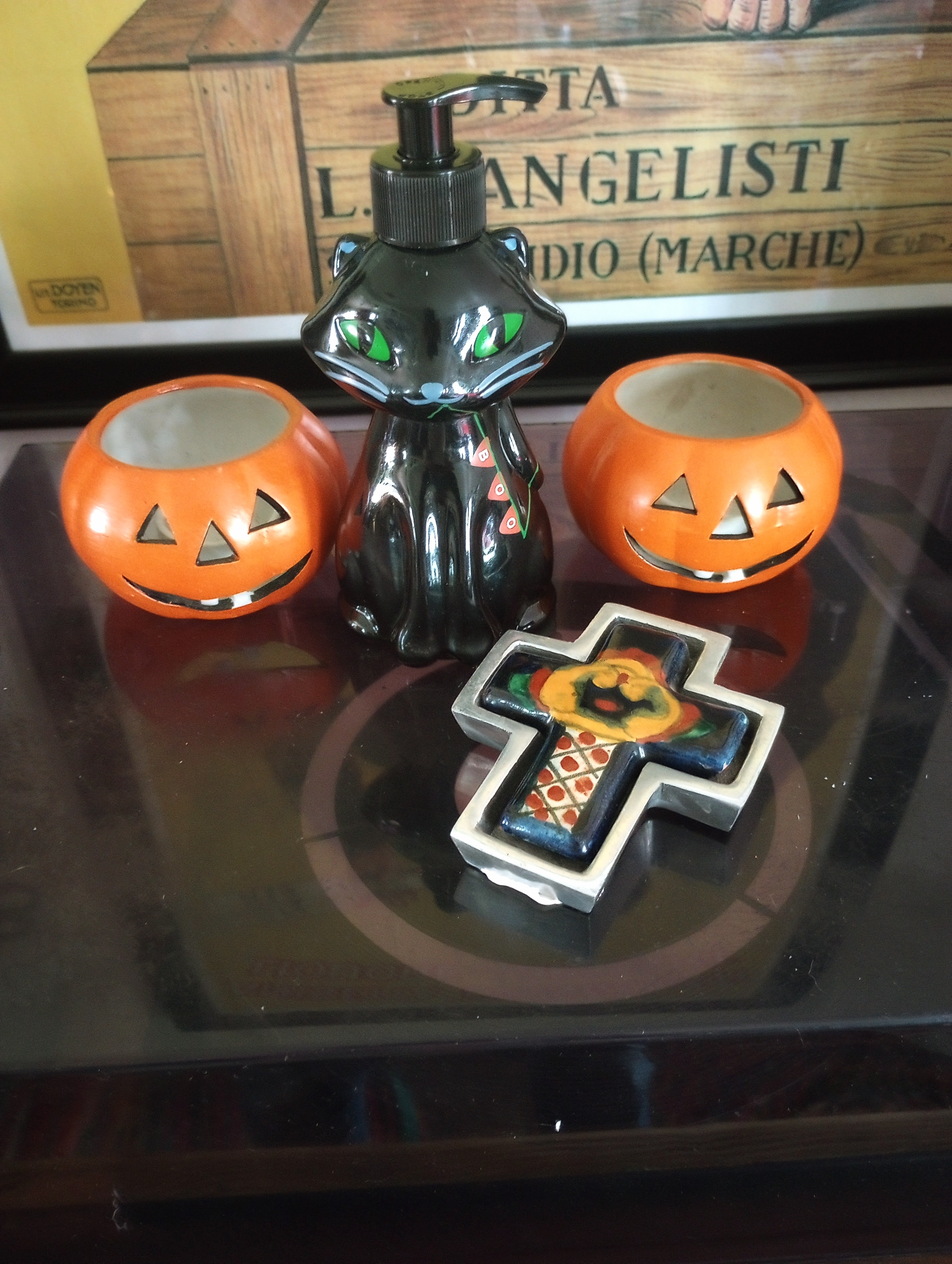 The soaps are brand new. The cat is sugared vanilla and the ghost is pumpkin eggnog. They were $2 each. The pumpkin tea light holders were $1 each and although the cross isn’t Halloween, it has a heavy silver edge and it was also a dollar so i couldn’t pass it up.
