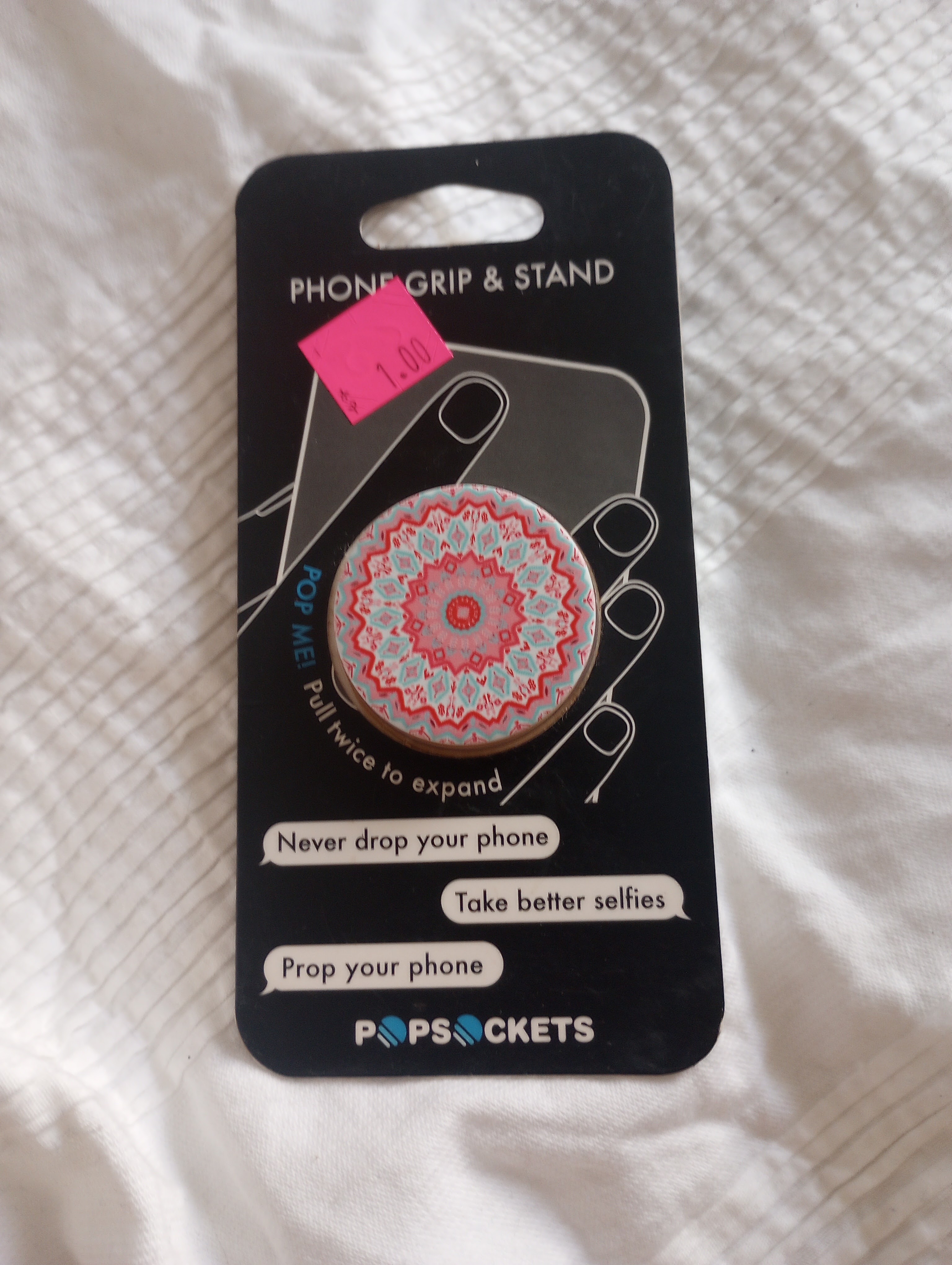 i refuse to pay almost $10 for a pop socket, but finding one for a dollar, absolutely. I love Mexican blankets so, yep, this came home with me.