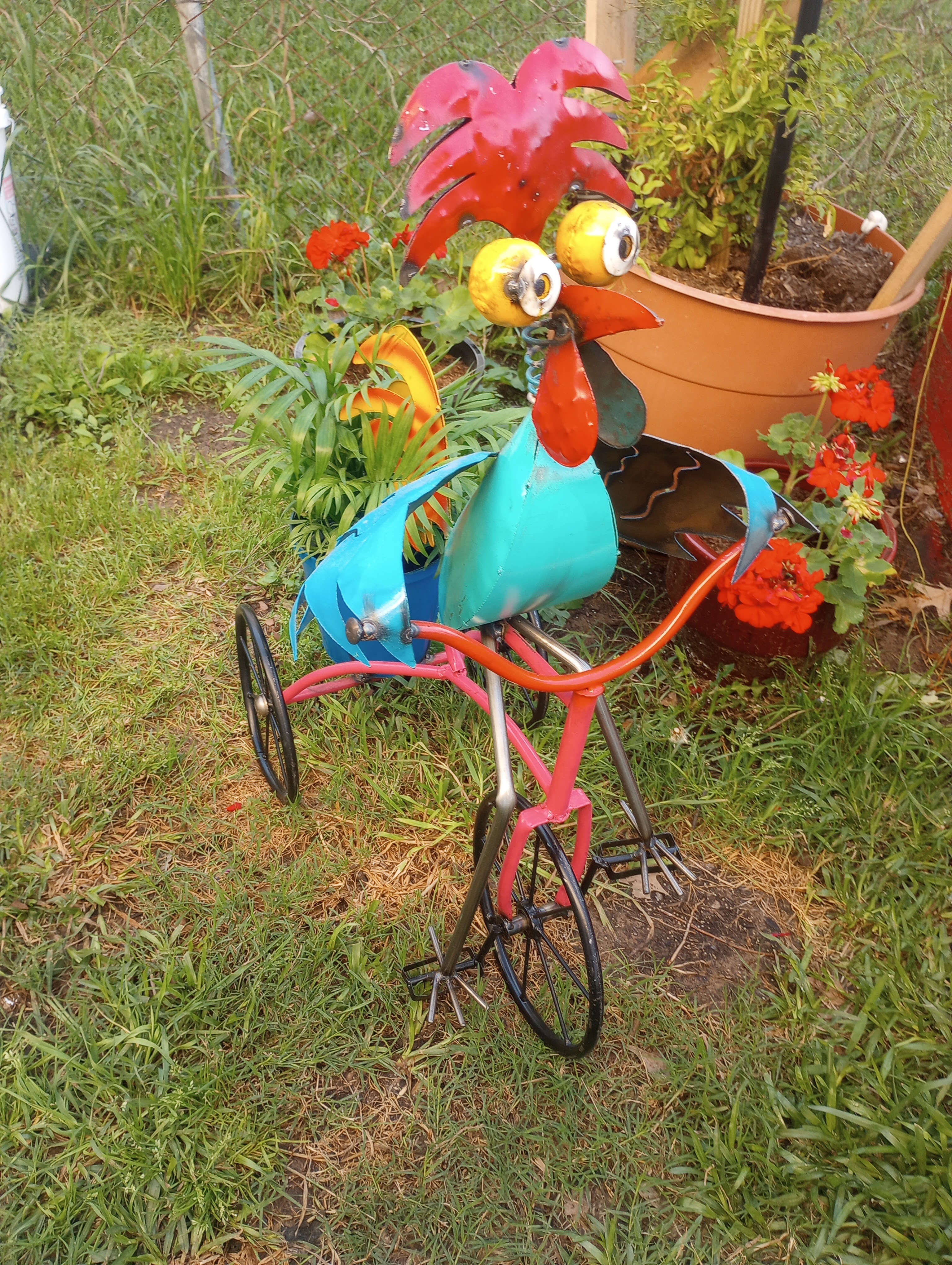 When Donny got home from work we needed to run to the grocery. He’s been itching to find a plant for the rooster he got me for my birthday. It has been sitting in our living room and has now found its place outside. Please excuse the dead circles, we have moved a lot of pots to the backyard. It’s some kind of palm. I just know it works well in shade or sun.