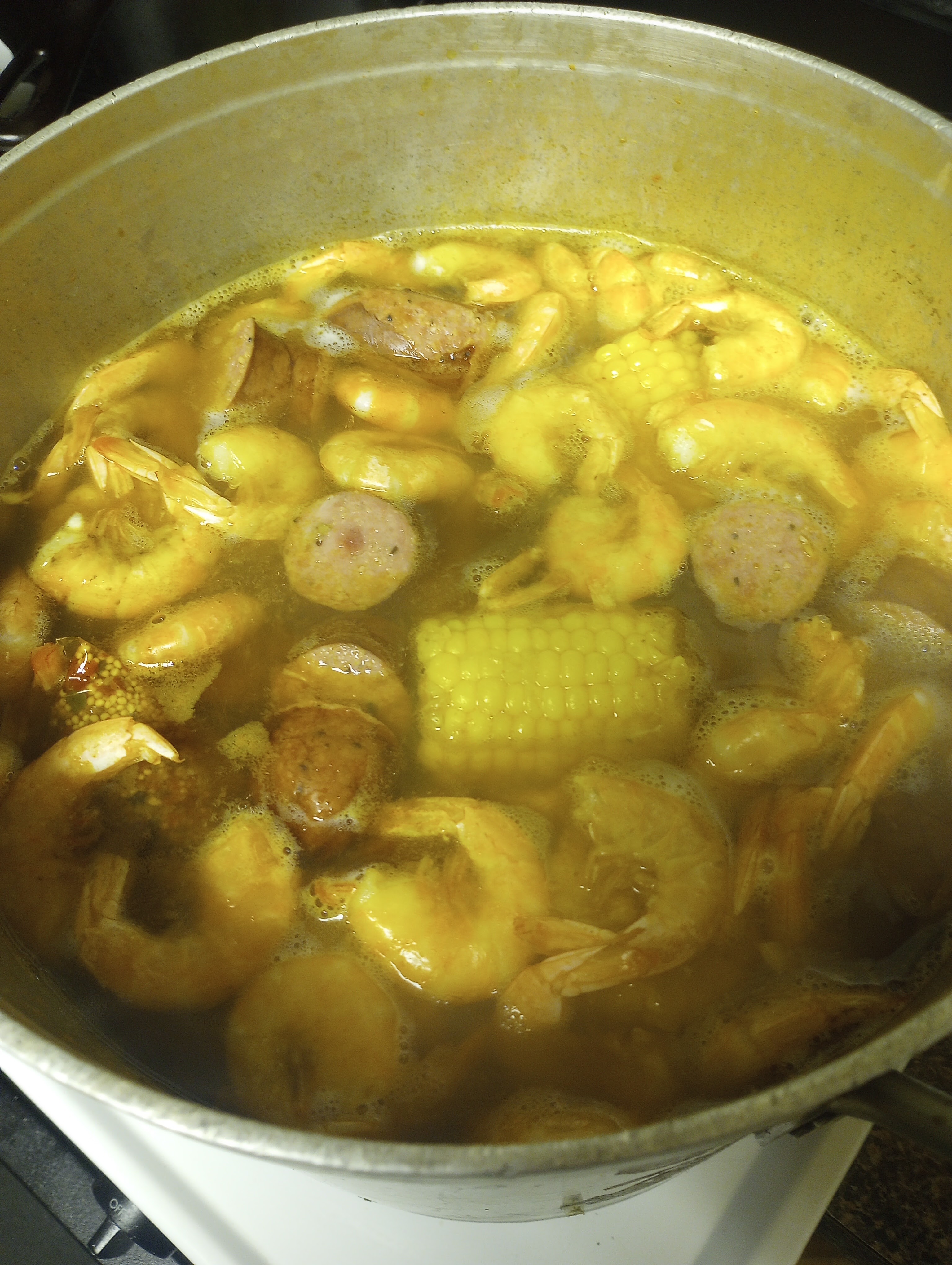 I make a pretty simple boil. Fill a big pot with water. Add seasoning and red potatoes. Boil until they are tender. Add sausage and corn on the cob. Boil for 5 minutes. Add shrimp and boil for 3 minutes. You’re done.