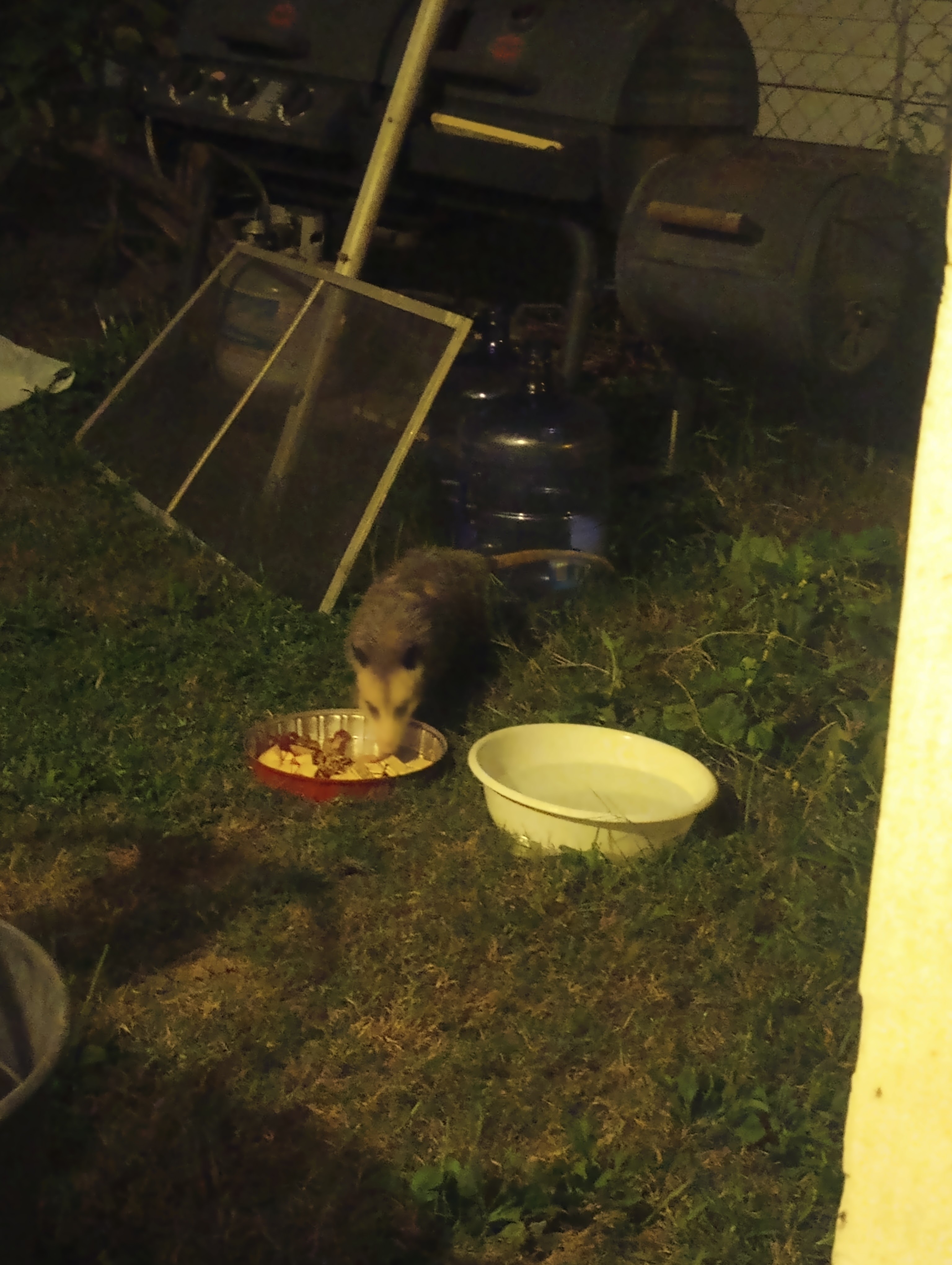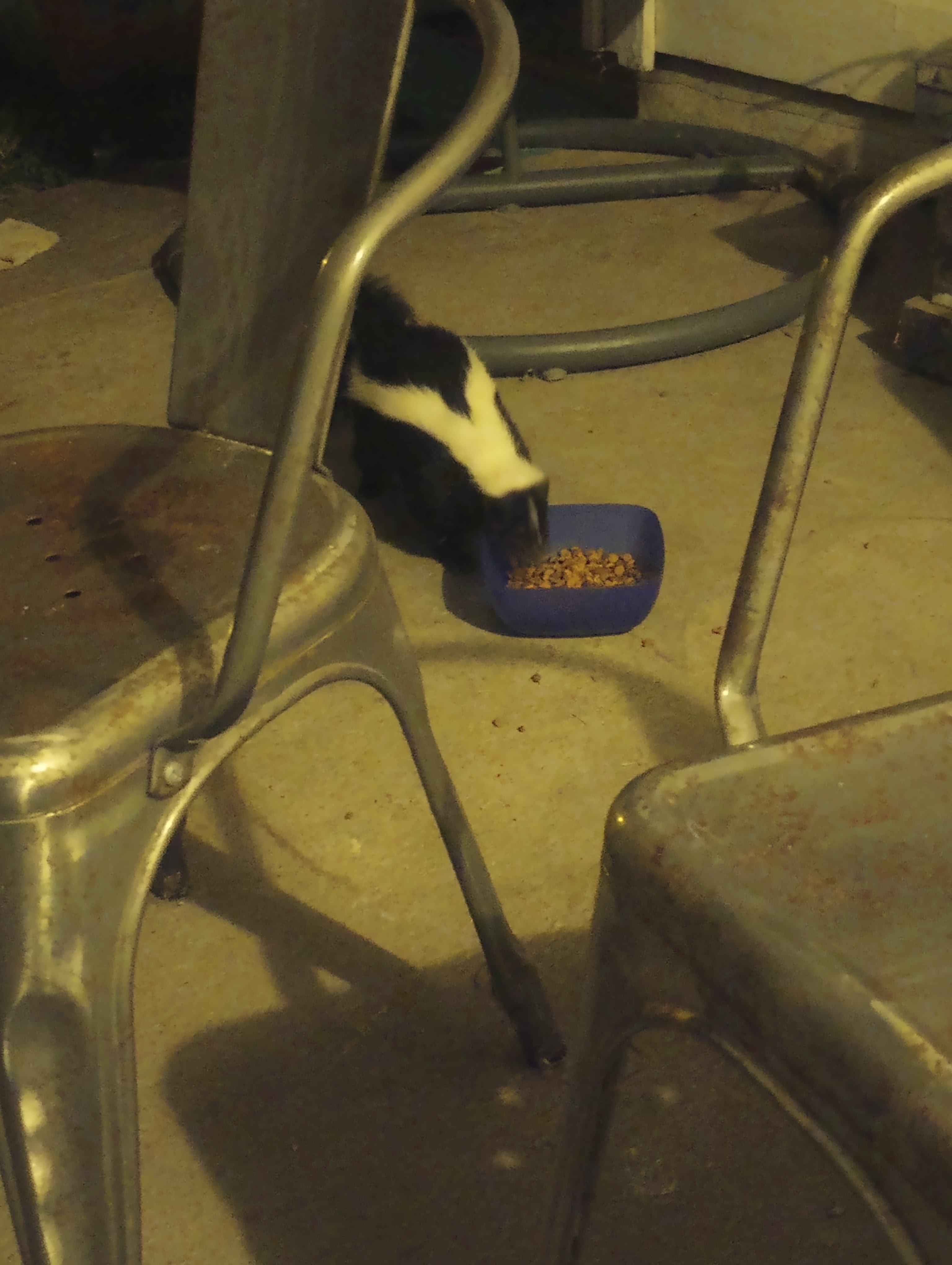 I feed the night critters (and the day ones also). We have a sweet little skunk that either got hit by a car or was born with a defect. He cannot walk so he slithers. It’s almost like he’s partially paralyzed. The problem with that is that it makes him incontinent. I was putting the food bowl on the patio until I realized that he cannot help it when his “stink” slips out. So now I feed him in the grass away from us.