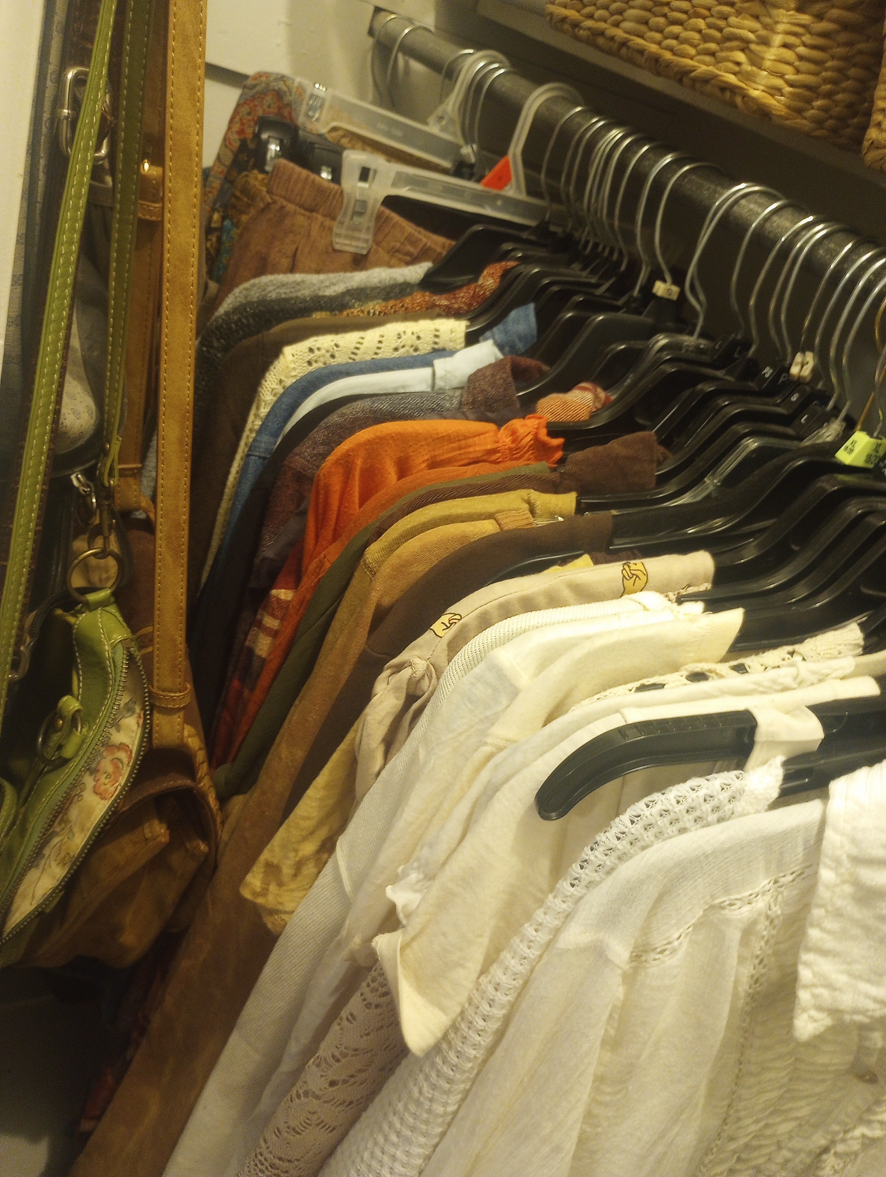 I decided to pare down my wardrobe quite a bit. I tried every single item on to make sure it fit well and I still liked it. I ended up with a trash bag full to donate. I’m always nosy about how people fit everything into a small space and what all goes into that said space. So here is my take on it.