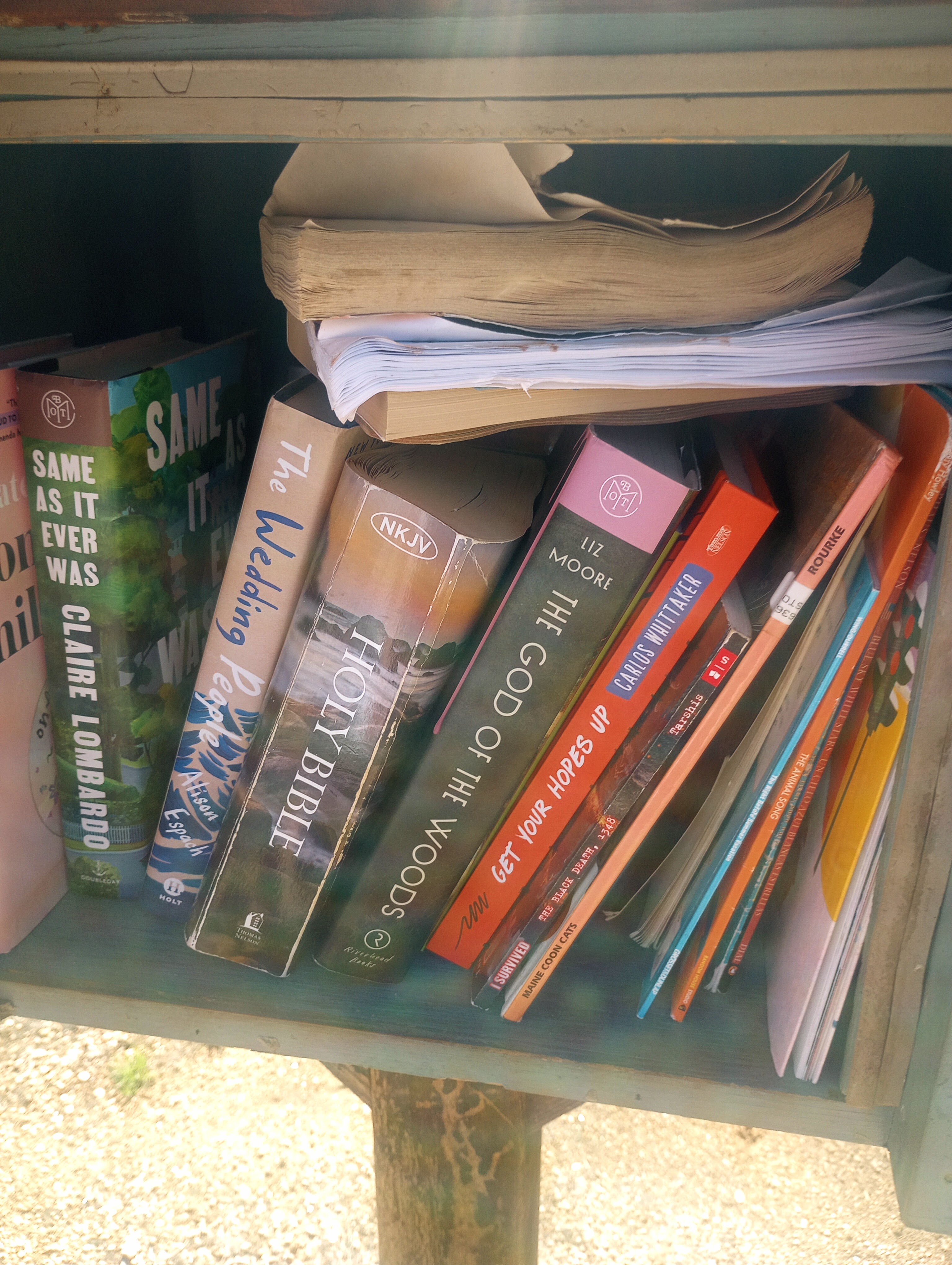 When we opened the library box all of the books were wet. We have gotten a lot of rain lately, but with the leaky roof, I wasn’t going to add my books.