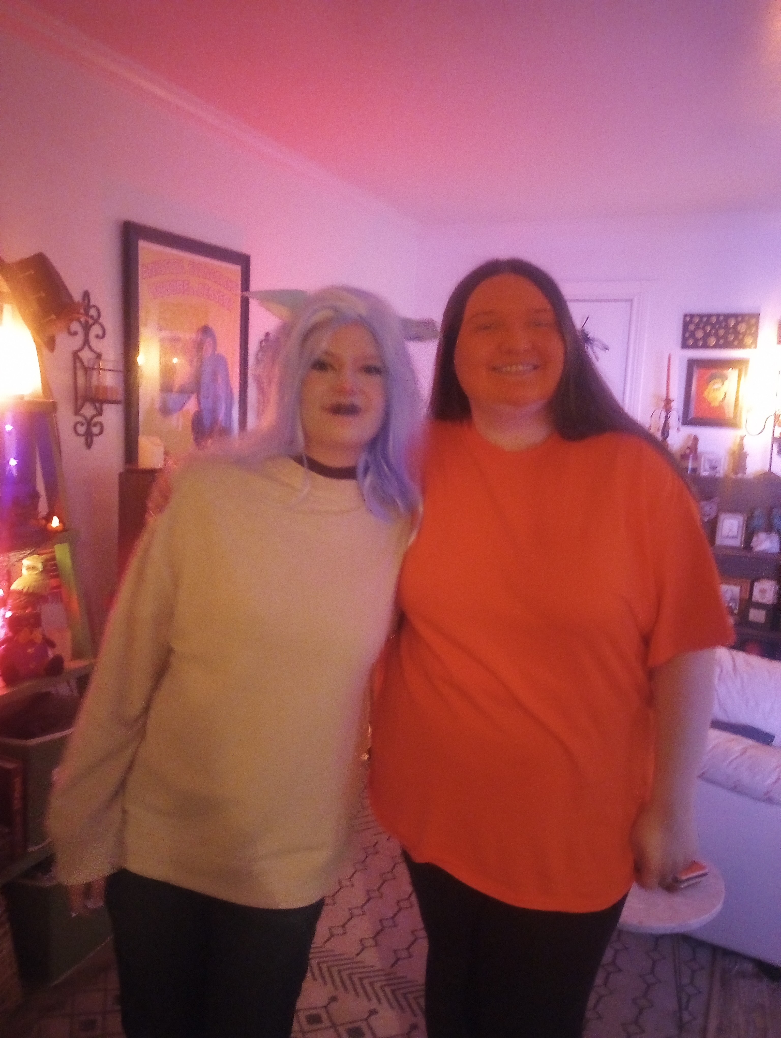Hannah was Gumball and her Olivia was Darwin (a fish. she had a fin but you can’t see it from the front) from the Adventures of Gumball.