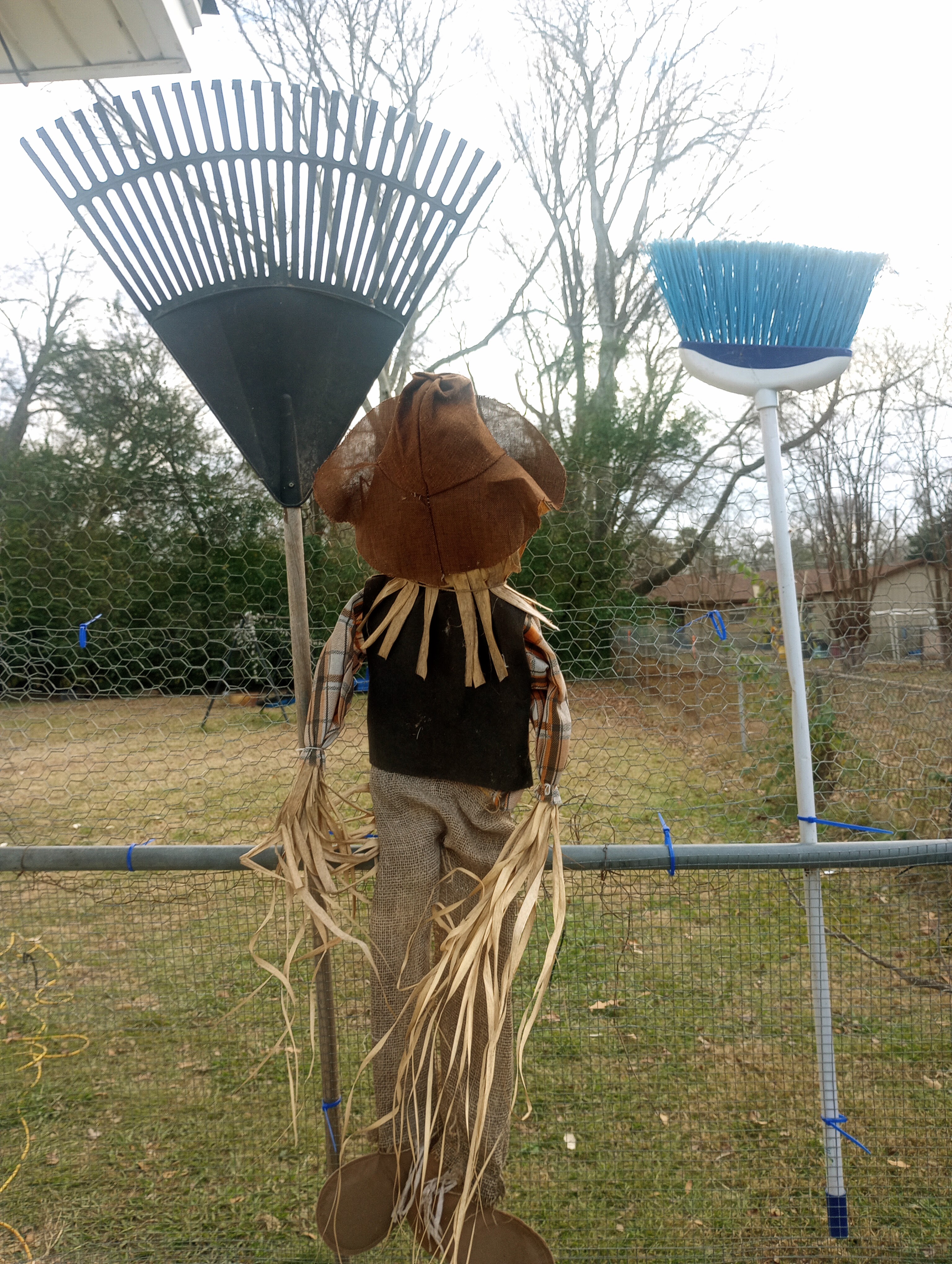 Lately some of our chickens have been very bad. There are 3 ring leaders that insist on flying over the gate and running amok in our yard and all of the neighbors’ yards. I spend a lot of time during my day herding chickens back to their yard. Donny and I spent a lot of the day outside. I was taking down the Christmas lights and he was adding more insulation to the coop because we are supposed to be getting some colder weather later this week. Those 3 chickens plus some other followers in the group kept getting over the gate. Donny realized what a pain it was to be wrangling chickens multiple times. He brought out more chicken wire to raise the gate area even more. We thought that worked until one of the chickens flew right over it. I had had enough. I decided to do whatever it took to keep them in our backyard.Donny told me, “you can be serious?’. Oh, but I was. All it took were 2 brooms and a rake plus several zip ties. I also got our scarecrow out of the shed and made sure to chase the chickens around waving it and growling loudly. I figured if they were scared of it they wouldn’t come near it. This is how it turned out.