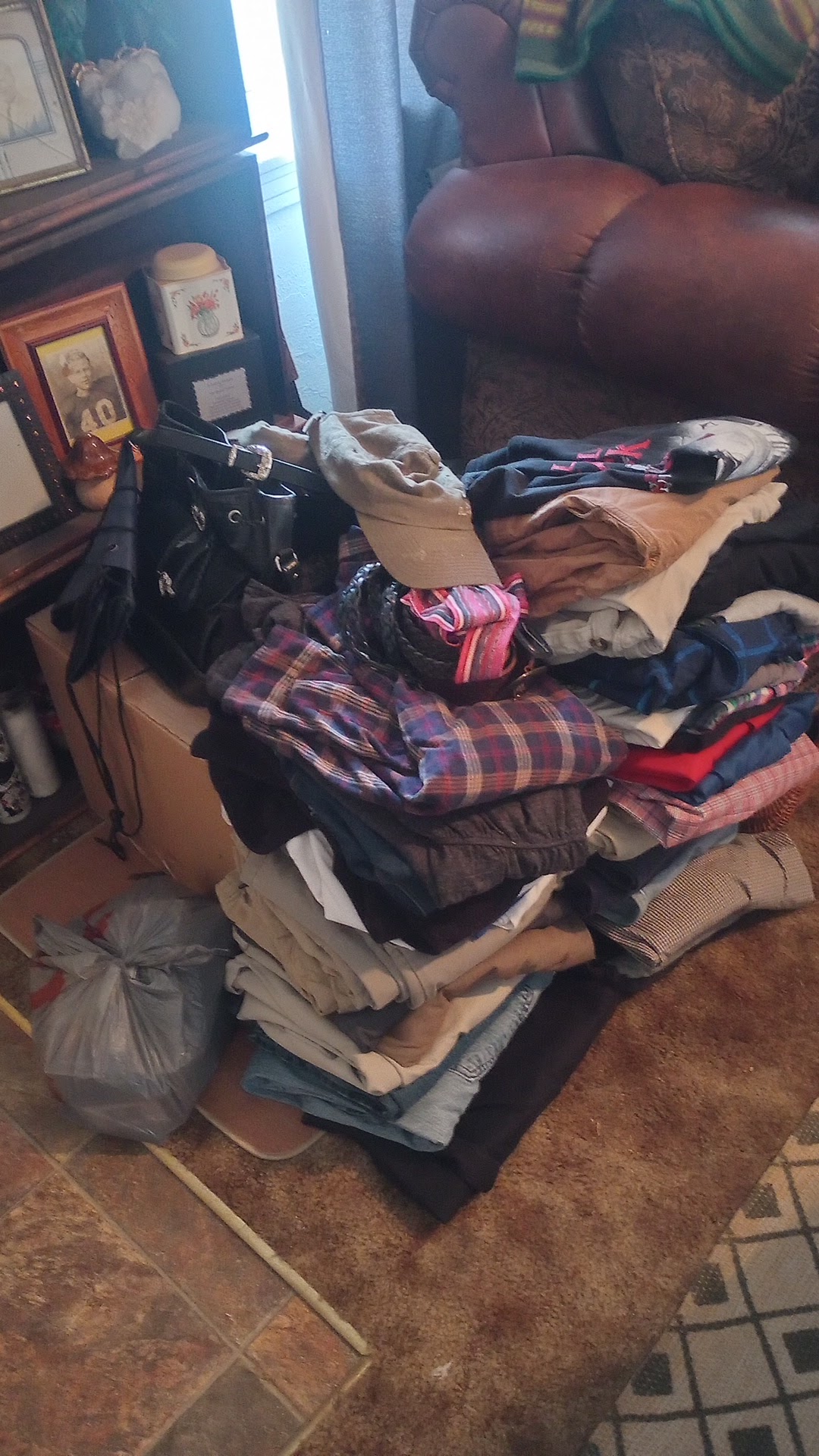 It’s only Tuesday, but this week has already been a juggling act. Donny got had jury duty on Monday. The guy settled, so there was no trial. He came home for a bit since he had taken the morning and afternoon off just in case he was chosen. I got a wild hair and decided that we needed to clean out our bedroom closet. Donny has two large fabric cubes that he had just been throwing clothes in that either didn’t fit or he didn’t like. It became a problem when every time I had to pull down my jeans basket his stuff would fall on my head. I couldn’t go through it because I didn’t even know what all was in there. Well yesterday he went through both cubes and the hanging clothes. I went through my stuff and this is what we accomplished.